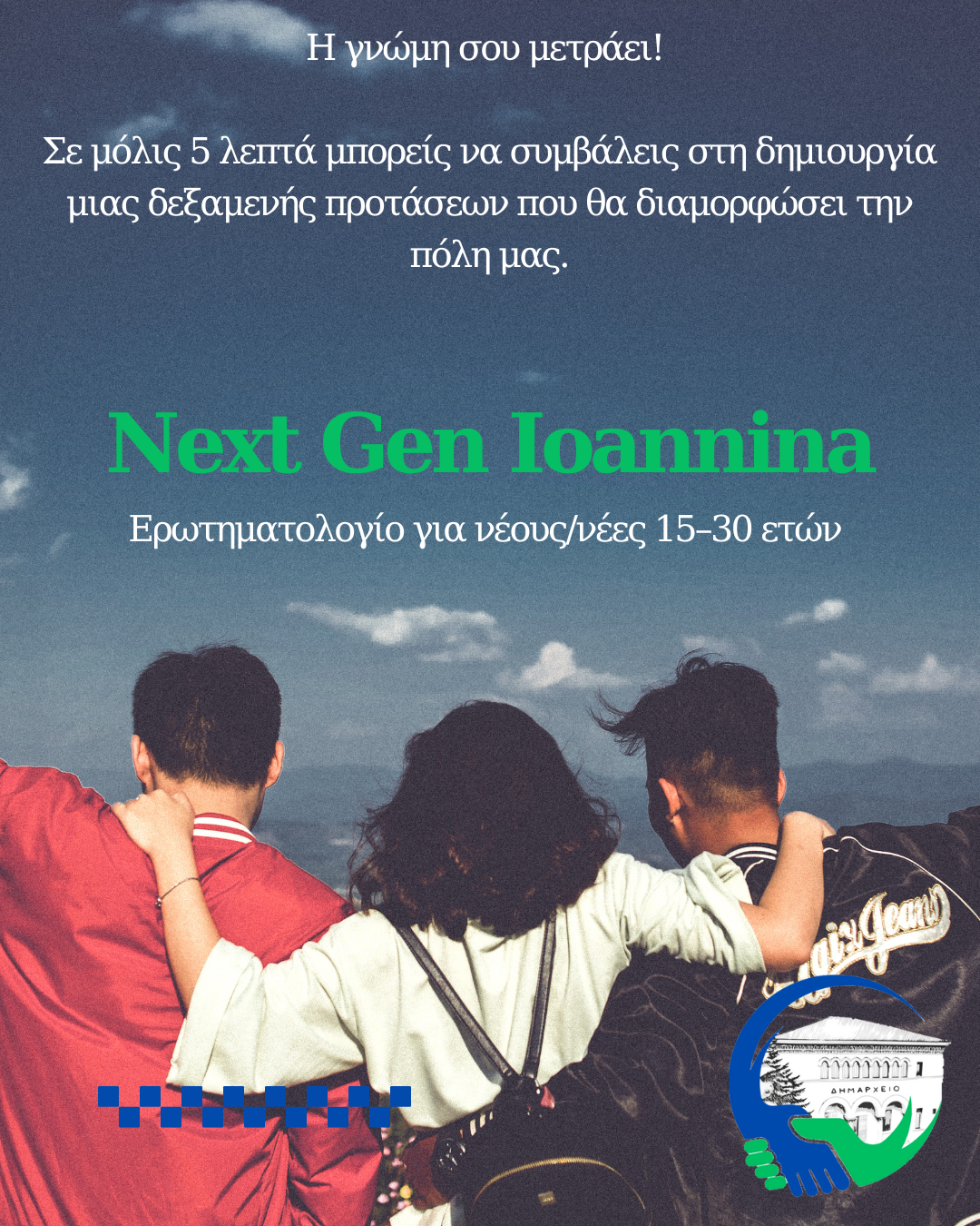 το Δημοτικό Συμβούλιο Νέων του Δήμου Ιωαννιτών έχει δημιουργήσει ένα ερωτηματολόγιο για νέους ηλικίας 15–30 ετών, με στόχο την καταγραφή των απόψεων, των αναγκών και των προτεραιοτήτων τους για την πόλη μας.Το ερωτηματολόγιο είναι διαθέσιμο στον παρακάτω σύνδεσμο: